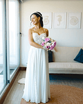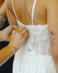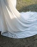 Descripción del vestido: Vestido cómodo y romántico con corset de encaje y seda con encaje en el resto del vestido, todo terreno! Se entrega lavado listo para usar, incluye tocado corona.