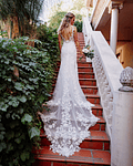 Falda de crepè y espectacular cola de tul con bordado de encaje.