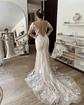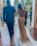 Es un diseño skin (sirena) color nude con aplicaciones bordados y una capa de tela glosy (Cola larga que se puede recoger). Súper ajustable, amolda el cuerpo. En la espalda pareciera que fuera descubierta que tiene una capa transparente. Cada detalle es único. Tengo comprobante de compra y contrato.