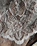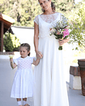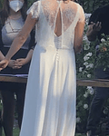 Descripción del vestido: Vestido al sesgo. Pollera de crepe + gasa, con corte vertical en el centro que se abre abajo en un tajo. Corte de cintura alta. Escote y espalda en V. Blusa de encaje con cuello bote, mangas cortas y abrochada con un botón en la espalda. Terminación con botones.